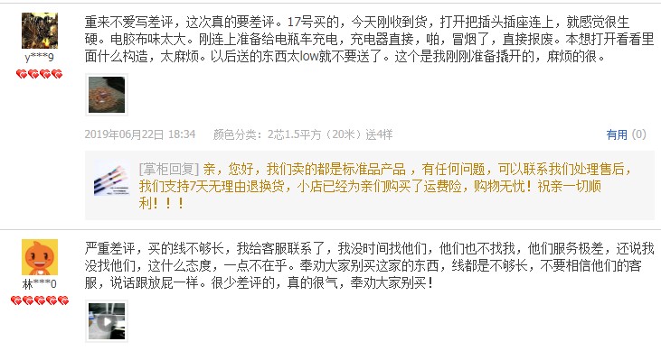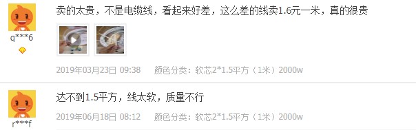 評價截圖有很多,我這邊就不一 一發(fā)出來了,總結幾個特征,冒充國標,截面積虛標,米數不足,導體斷線,鋁鍍銅,這個就是低價的本質,如果你是買回家當擺設并且不怕刺鼻味的,盡可能多買點,其余用途作為晾衣繩都怕斷。